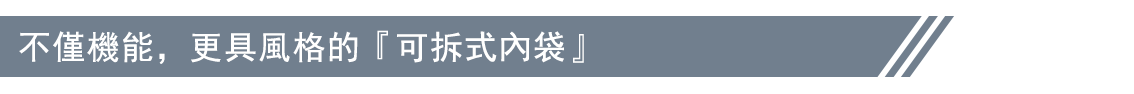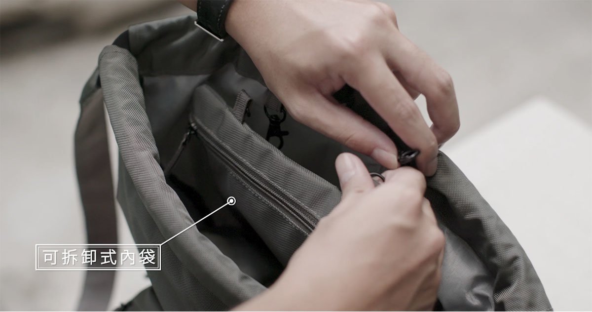 內裏夾層則是由一個大主體空間,搭配一個『固定式內袋』與一個『可拆式內袋』所構成,讓你輕鬆有條理的收納如13吋筆電、書本、毛巾與衣物等日常用品。而可拆式小內袋則可以任意拆組成行動小包獨立使用,讓你享受輕鬆穿搭卻變換無窮的背包樂趣。