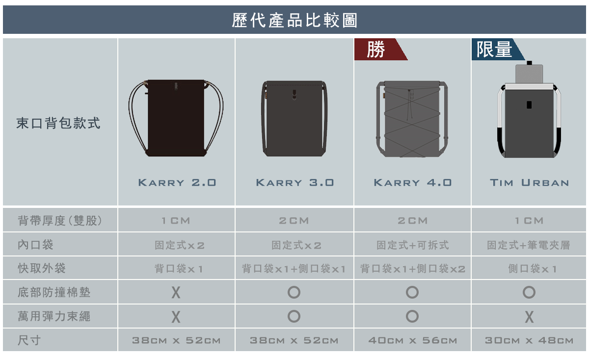 從第一代KARRY 2.0到KARRY 3.0量產上市,我們收集到來自世界各地上千份問卷與使用者回饋,這讓我們更清楚地了解使用者需求與愛好,也更知道如何透過設計改良與產品升級打造一個完美的束口後背包。 2020年我們推出了【KARRY 4.0 - 新經典束口包】與嘖嘖限定限量款【TIM URBAN - 都會遊俠包】希望保留束口包獨有的特色,並運用更質輕、耐磨的布料,優化背負體驗,重新賦予產品新定義,設計出符合現代人對差旅與休閒需求的雙料束口後背包,讓你從容應付百變場合與日常穿搭。